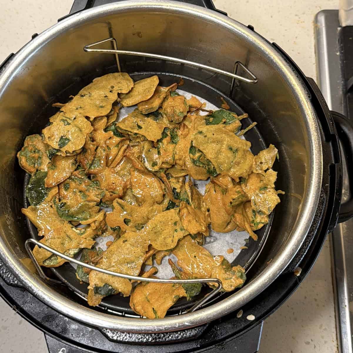 This air fryer version recreates the same crispy spinach leaves with far less oil. The batter-coated spinach leaves cook until light and crunchy, creating a healthier version of palak patta chaat without the need for deep frying.