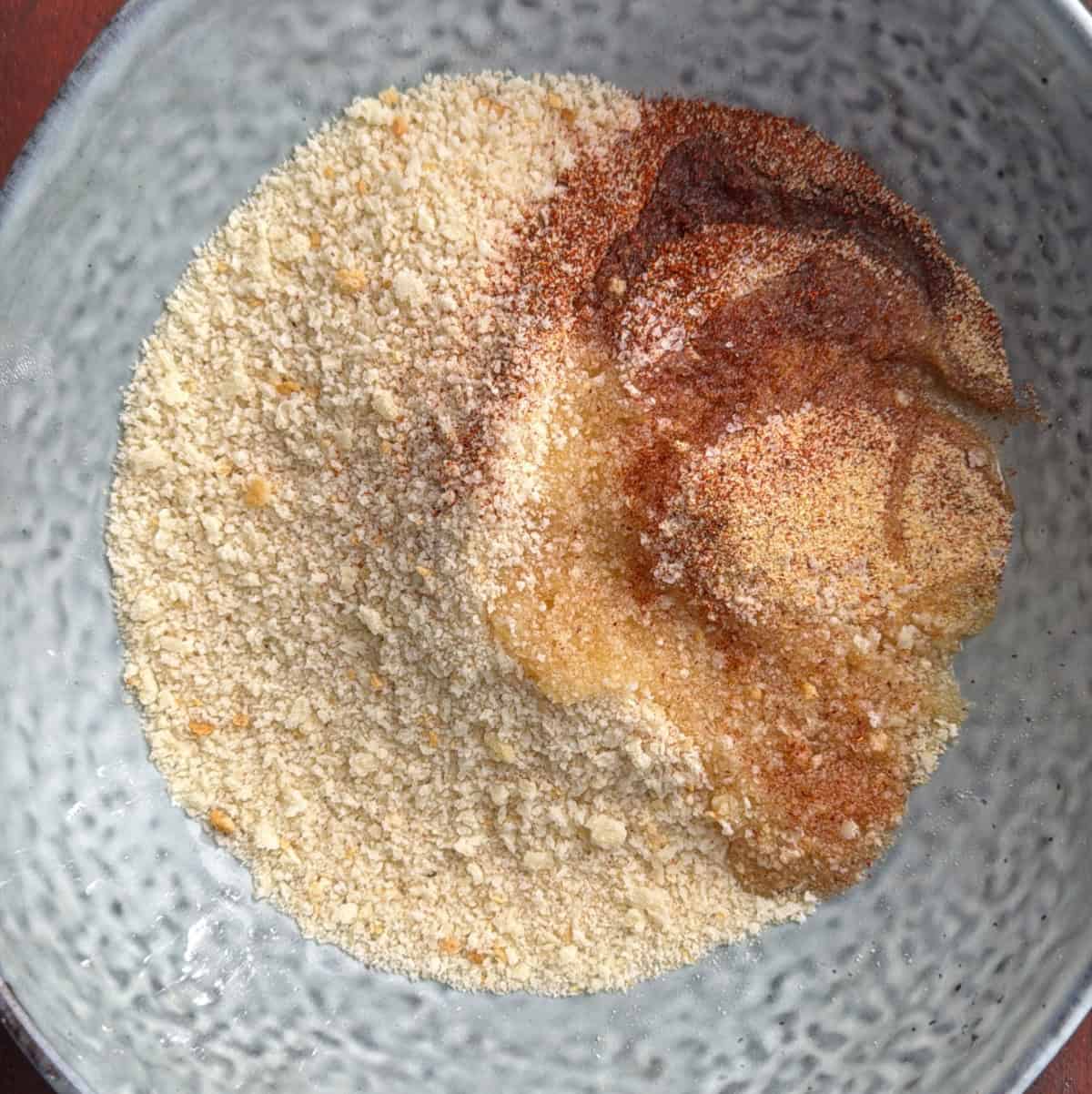 2. Mix breadcrumbs,spices and oil .Transfer the tofu pieces into the breadcrumb mix