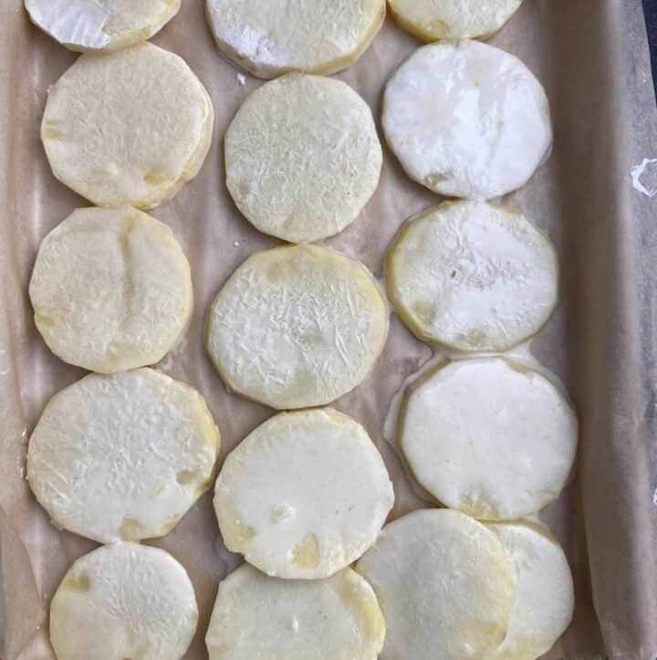 Make your potato shapes and store them in a tray after covering with a cling film. Store them in a freezer, until you are ready to cook.