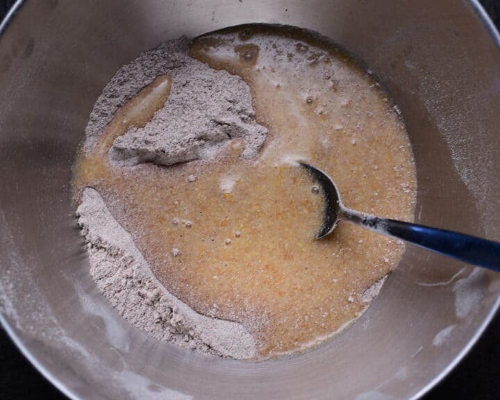 2. Add the flax seed mixture/chia seed mixture to ragi flour. (the below step shows flax seed mixture)