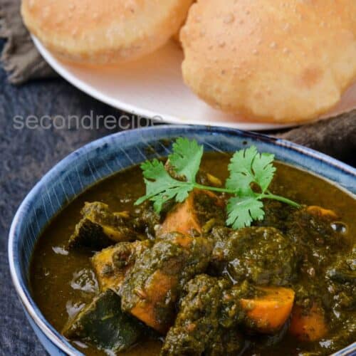 We cook small amounts of variety of vegetables in a spinach based gravy. It is also a way to utilize small left over raw veggies in a spinach based gravy. First of all,this curry makes use of winter vegetables which mother nature welcomes with time. There is a change of season, when autumn ends and winter appears. Hence, there is a distinct change of veggies in the local market.Sata means seven while Bhajiyun meaning vegetables. This mix vegetable recipe can be made in a tomato gravy as well.