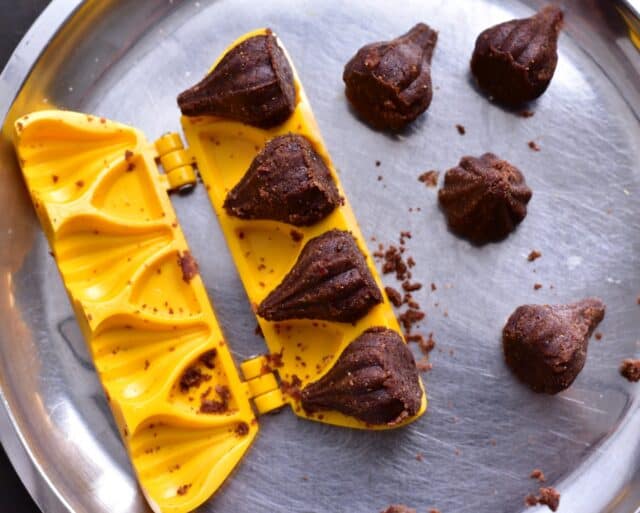 4. Roll little mixture into a small ball and add it to modak molds. Open the mold and remove excess mix to get a proper modak shape. Even kids can help you do this. This entire mixture yields 12 pieces. Store them in an air tight container at room temperature.